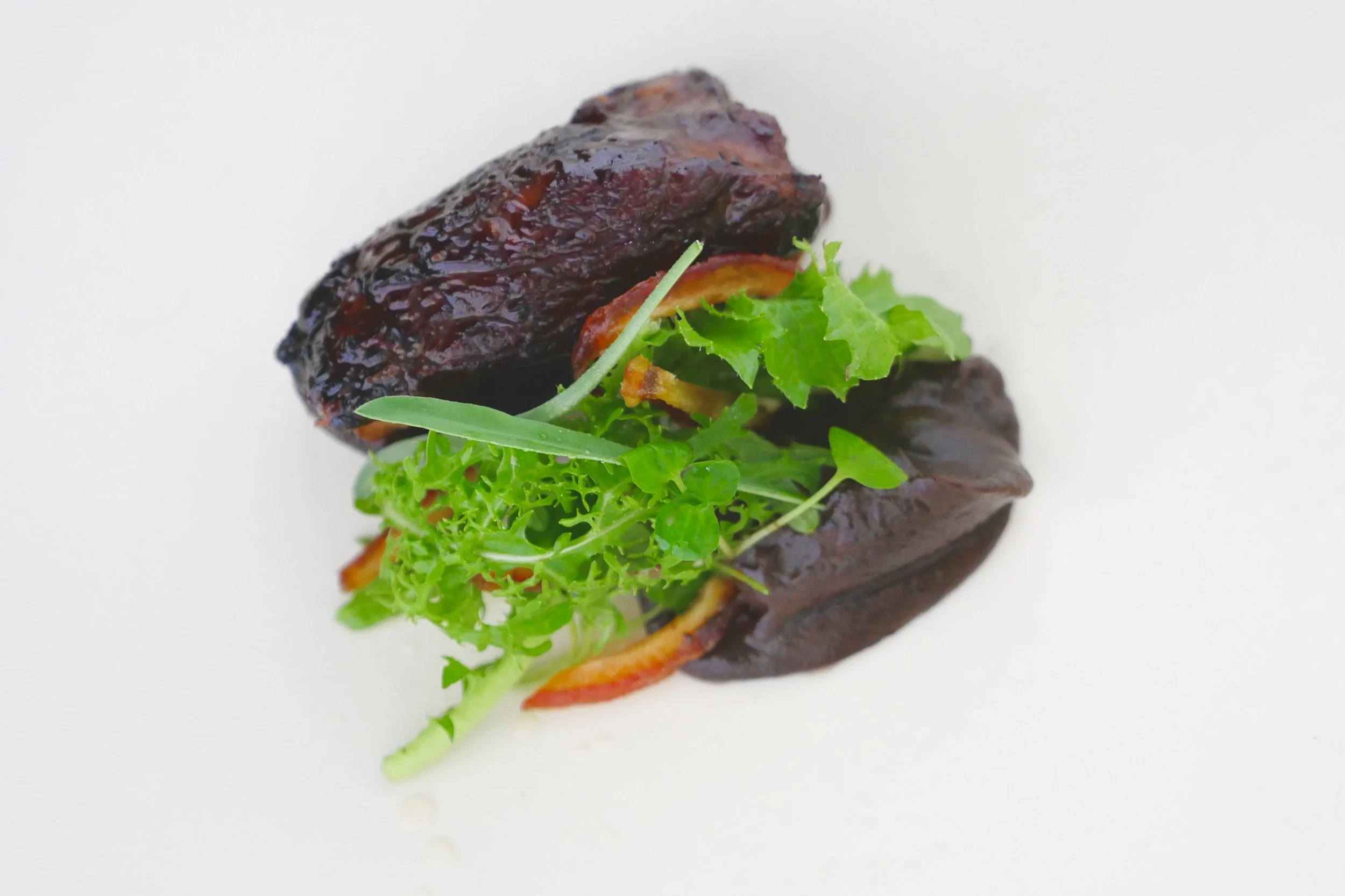 LAMB COLLAR, CHARRED EGGPLANT, MUSTARD LEAVES, STRIDOLO & MUSHROOM VINEGAR
